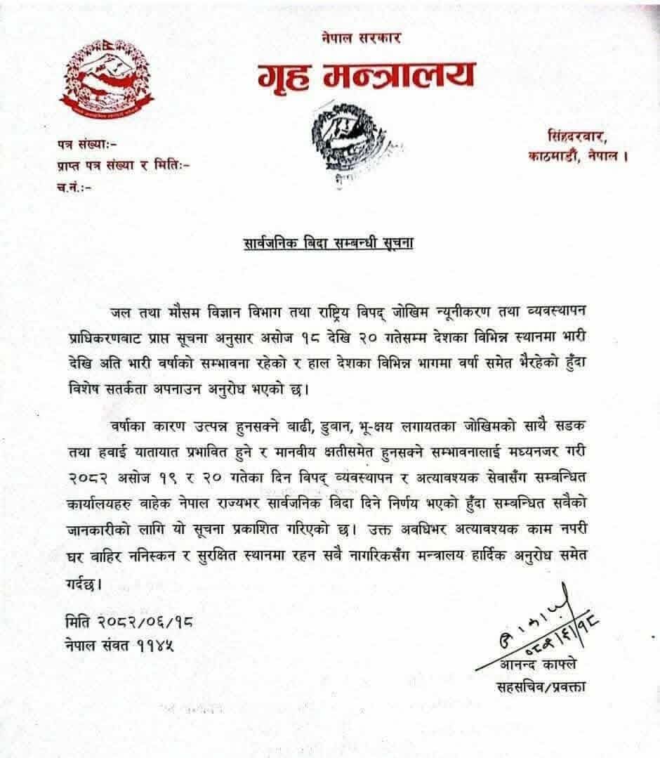 काठमाडौँ – सरकारले आज र भोलि सार्वजनिक बिदा दिएको छ। गृह मन्त्रालयले शनिबार जारी गरेको सूचनामा देशका विभिन्न भागमा भारीदेखि अति भारी वर्षाको सम्भावना रहेको र जसका कारण आइपर्नसक्ने परिस्थितिलाई मध्यनजर गर्दै असोज १९ र २० गते सार्वजनिक बिदा निर्णय गरिएको उल्लेख छ ।