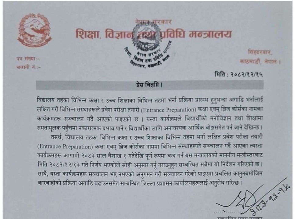 ‘विद्यालय तहका विभिन्न कक्षा र उच्च शिक्षाका विभिन्न तहमा भर्ना प्रक्रिया प्रारम्भ हुनुभन्दा अगाडि भर्नालाई लक्षित गरी विभिन्न संस्थाहरुले प्रवेश परीक्षा तयारी कक्षा एवं ब्रिज कोर्सका नाममा कार्यक्रम सञ्चालन गर्दै आएको पाइएको छ,’ विज्ञप्तिमा भनिएको छ, ‘यस्ता कार्यक्रमले विद्यार्थीको मनोविज्ञान तथा शिक्षामा समातामूलक पहुँचमा नकारात्मक प्रभाव पार्ने र विद्यार्थीका लागि अनावश्यक आर्थिक बोझ समेत पर्न जाने देखिन्छ ।’